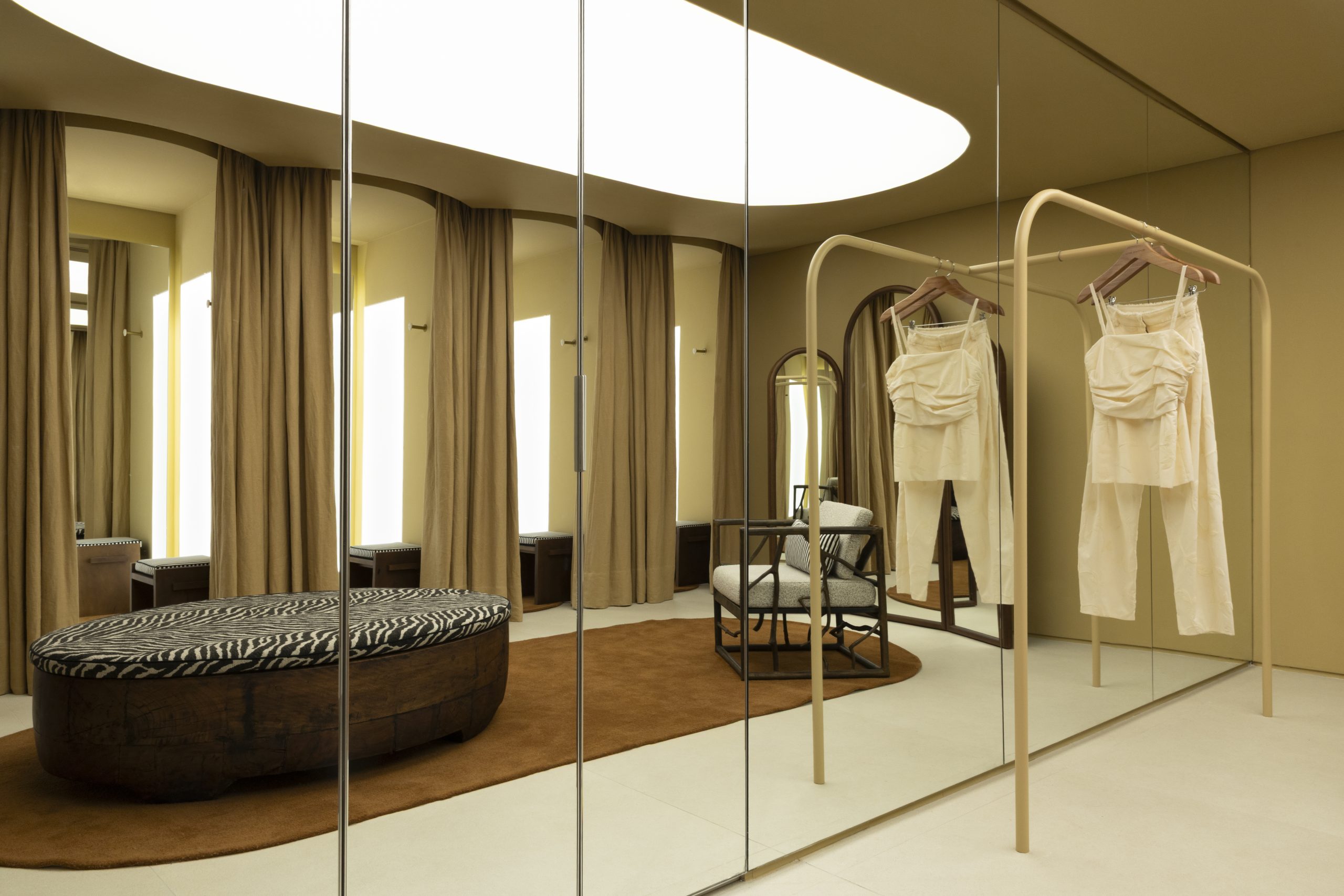A iluminação do espaço foi desenhada para valorizar as texturas e os materiais escolhidos. Os provadores seguem essa mesma linha: monocromáticos, neutros e envolventes, com cortinas no mesmo tom das paredes e mobiliário em madeira reflorestada. Ganchos feitos com aviamentos de CRIS BARROS e bancos especialmente desenhados reforçam a identidade até nos detalhes mais funcionais.