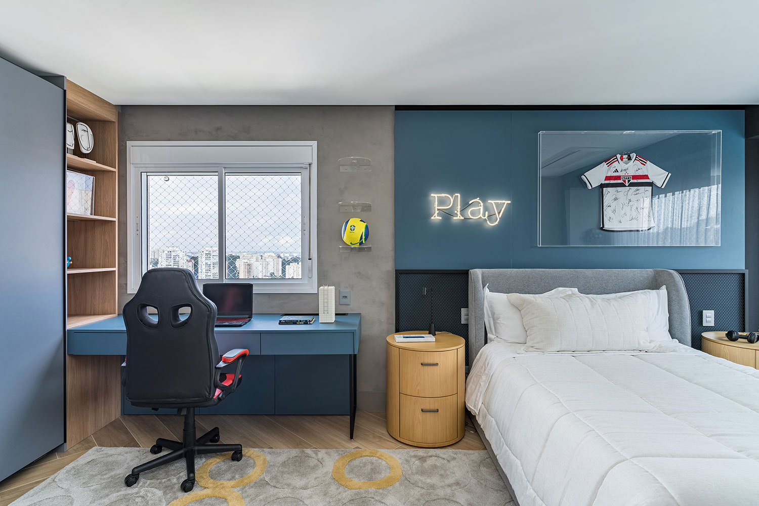 Com relação à cadeira, à primeira vista se parece com um modelo de escritório, mas a verdade é que ela se difere pela estrutura engendrada para entregar mais comodidade ao pescoço, ombros e costas. Sem contar que os modelos acabam entrando no clima com as cores que se completam ao projeto do dormitório.