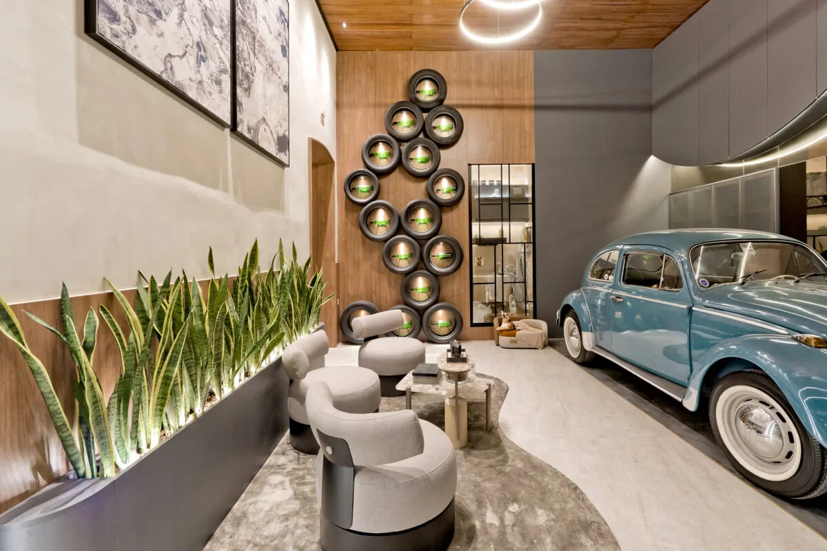 A área da mostra conta com três ambientes em um só: um lounge para descansar, um espaço que remete a um pub, pensado para reunir amigos e família, e o local em que fica um carro popular que é um ícone brasileiro. Todos os ambientes foram pensados para ser multifuncionais. O “pub”, por exemplo, conta com mini bar, jogos de tabuleiro, mesa de jantar e o projetor da Epson, que transmite conteúdos como jogos esportivos. A garagem também possui, além do carro, um cantinho pet e armários superiores, reforçando essa funcionalidade.
