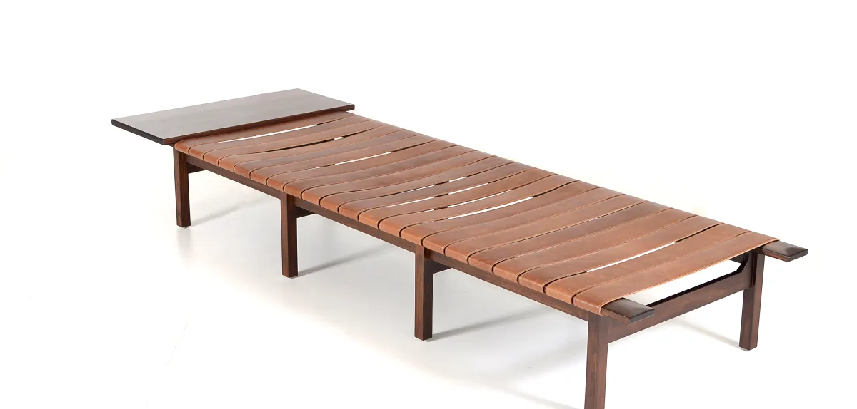 O banco Mares, encontrado no acervo familiar em 2024, combina couro e madeira em uma solução funcional e versátil.