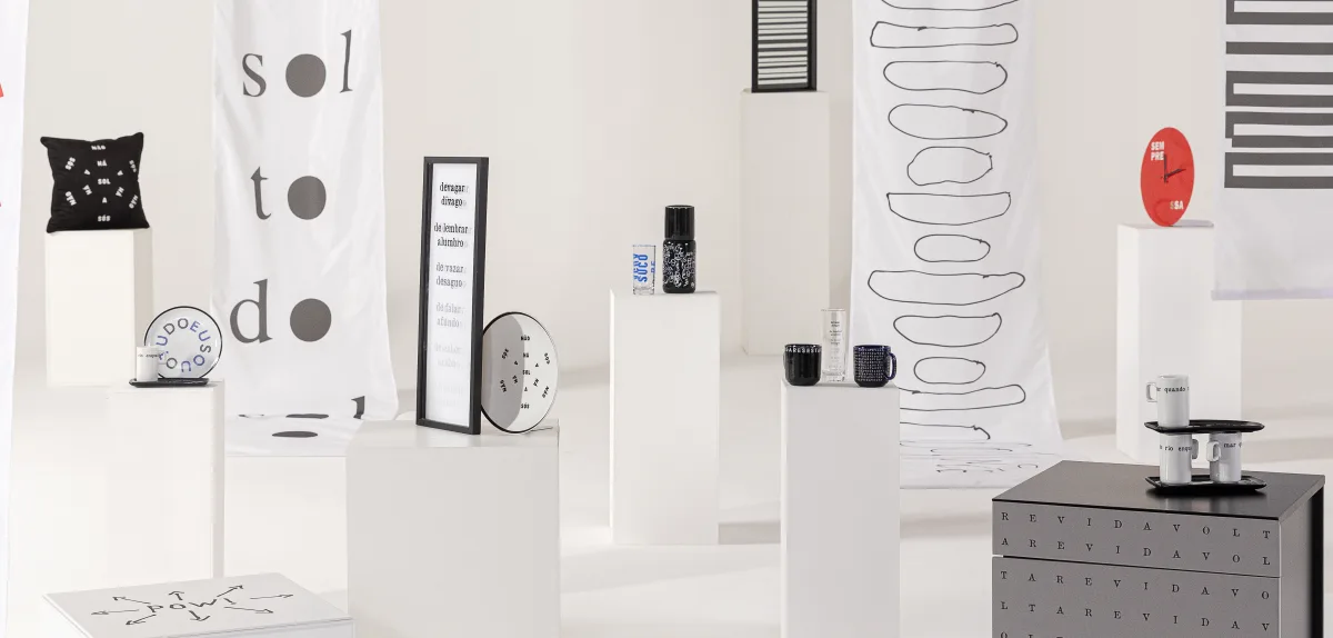 As peças exploram jogos tipográficos, cores contrastantes e formas inusitadas, marcas registradas da obra de Antunes, criando ambientes que vão além da decoração tradicional.