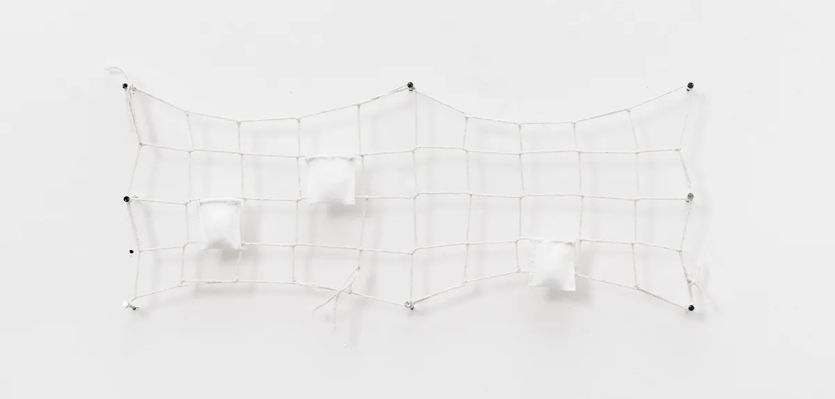 Inspirada nas tramas e tecelagens presentes nessas culturas, a artista construiu uma instalação feita à mão com barbante de algodão e trouxas de sal grosso, que se estende horizontalmente pelo espaço, convidando o público a se curvar ou atravessar a obra.